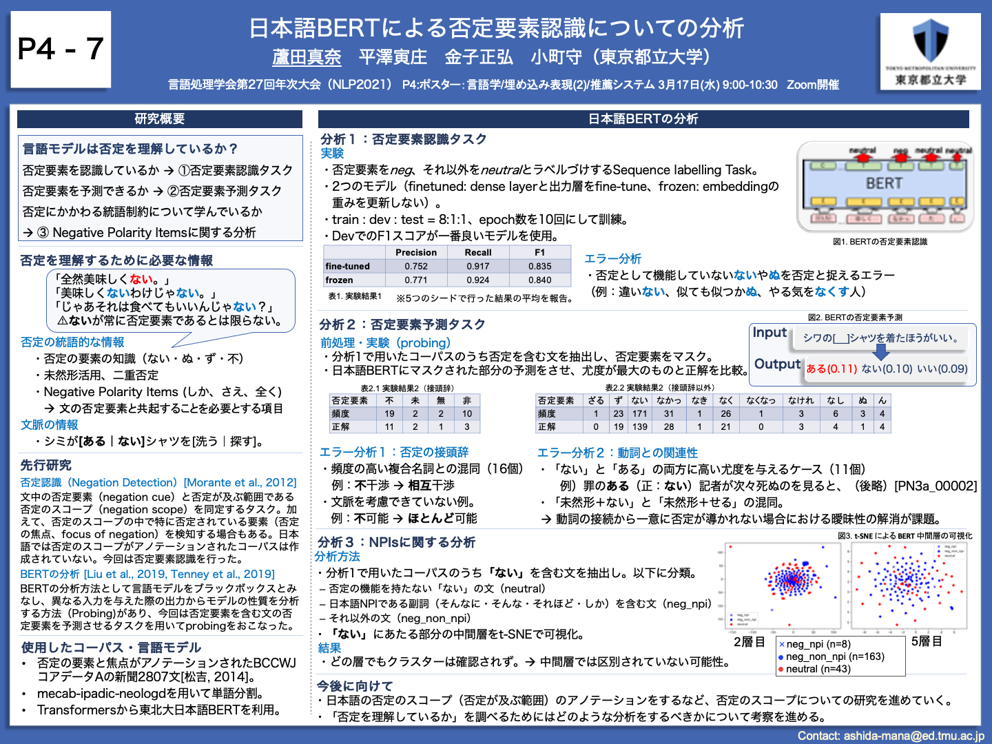 蘆田真奈、平澤寅庄、金子正弘、小町守, 日本語BERTによる否定要素認識についての分析, 言語処理学会第27回年次大会 (NLP2021)